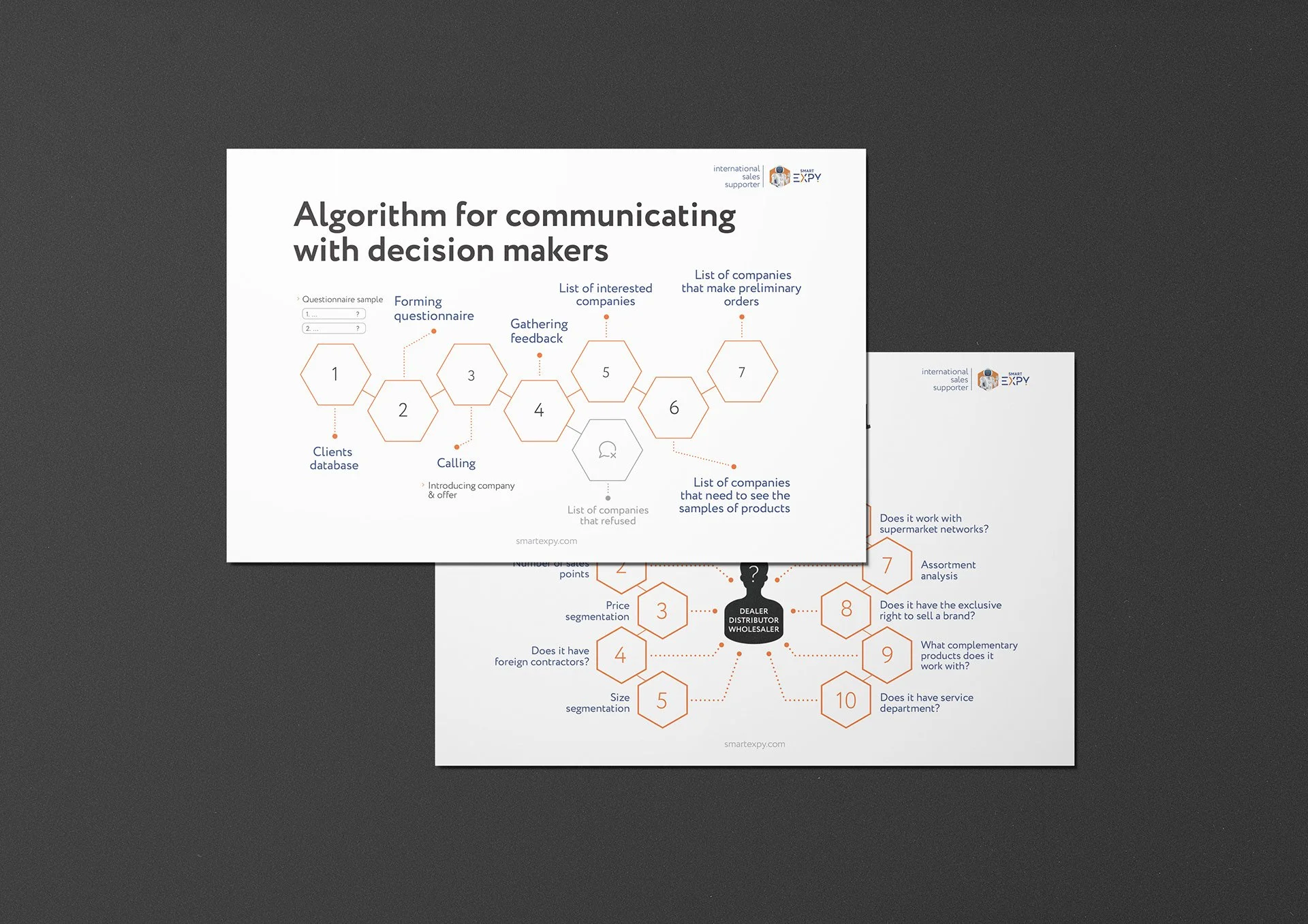 The design features a well-defined structure with bold headings, subheadings, and visual elements that naturally guide the viewer’s attention. A consistent branding approach, using a professional orange and blue colour scheme along with recurring hexagonal shapes, reinforces visual identity.